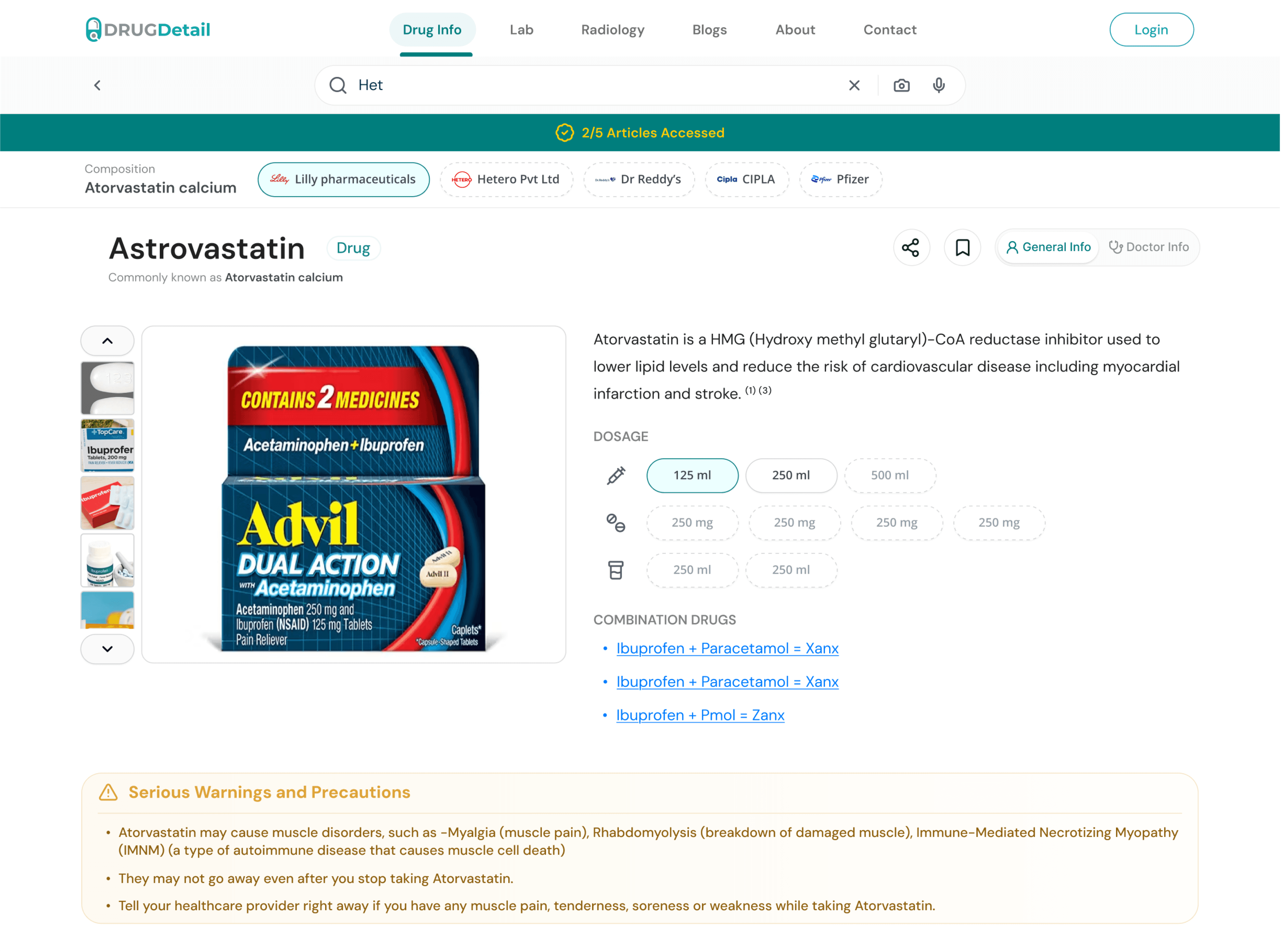 The main drug name is shown prominently with a short description, helping users instantly recognize the medicine they’re viewing.