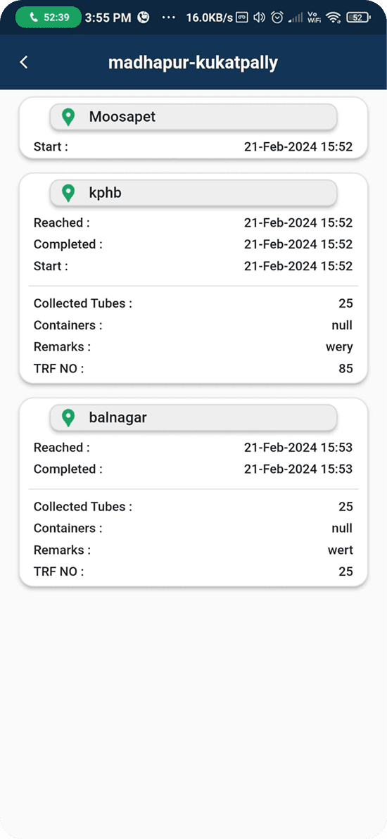 We redesigned the completed trips view to show each pickup location in sequence, highlighting where samples were collected and clearly indicating the final delivery point using route-based visuals.
