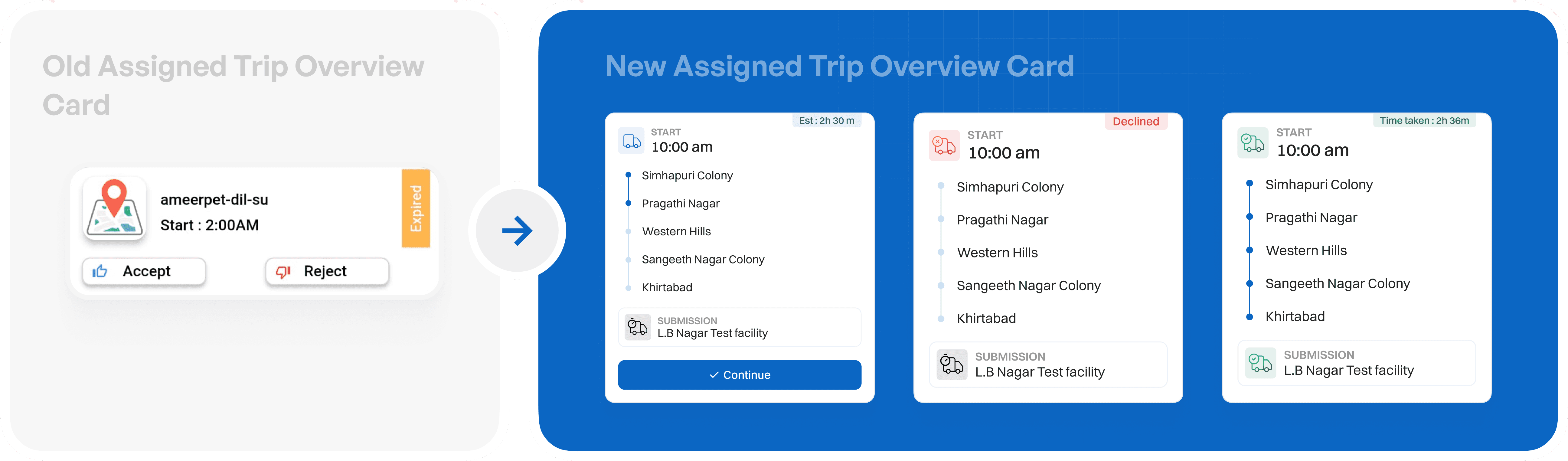 The card evolved from a simple, action-heavy listing into a structured, state-driven view with color-coded statuses, clear routes, timestamps, and guided actions—reducing confusion and improving trip execution efficiency.