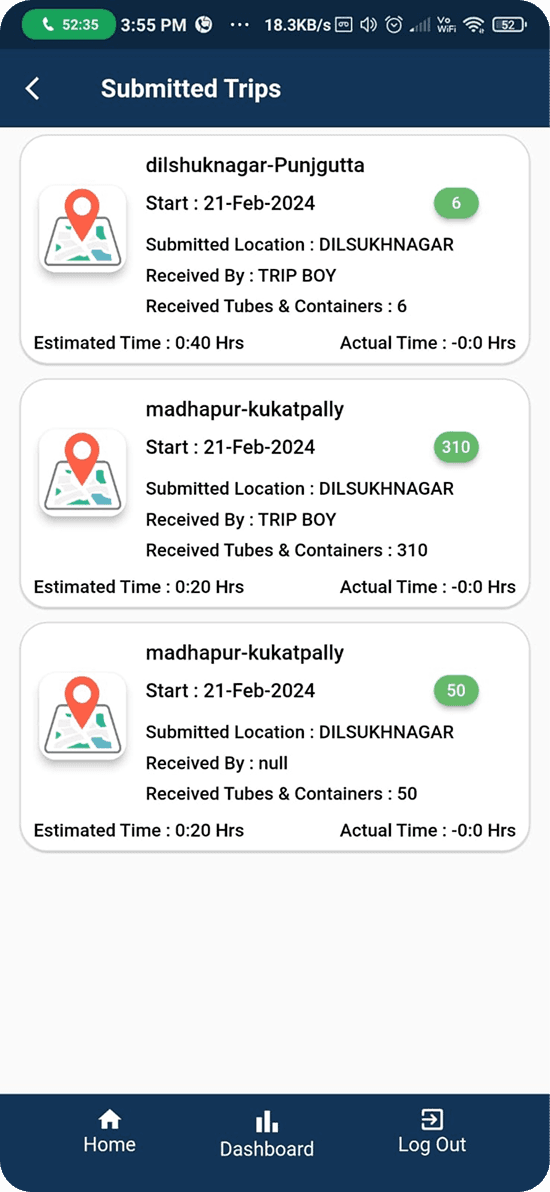 Important information such as receiver confirmation, tube counts, and actual trip duration required extra effort to scan, slowing verification, increasing confusion, and making daily trip review inefficient for logistics teams.