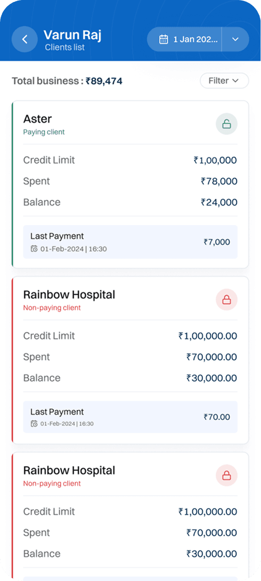 The screen displayed multiple client credit details together without clear hierarchy, making it difficult for managers to quickly assess credit limits, dues, and remaining balances per client.