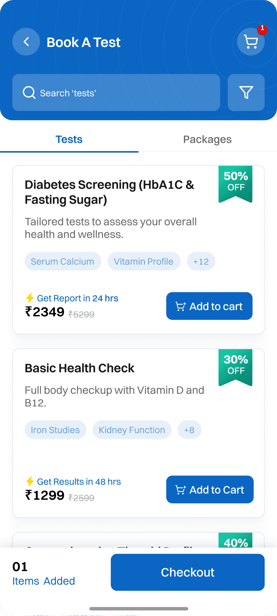 Clear search, filters, and add-to-cart actions reduce effort and decision time, helping users book the right tests confidently in just a few steps.