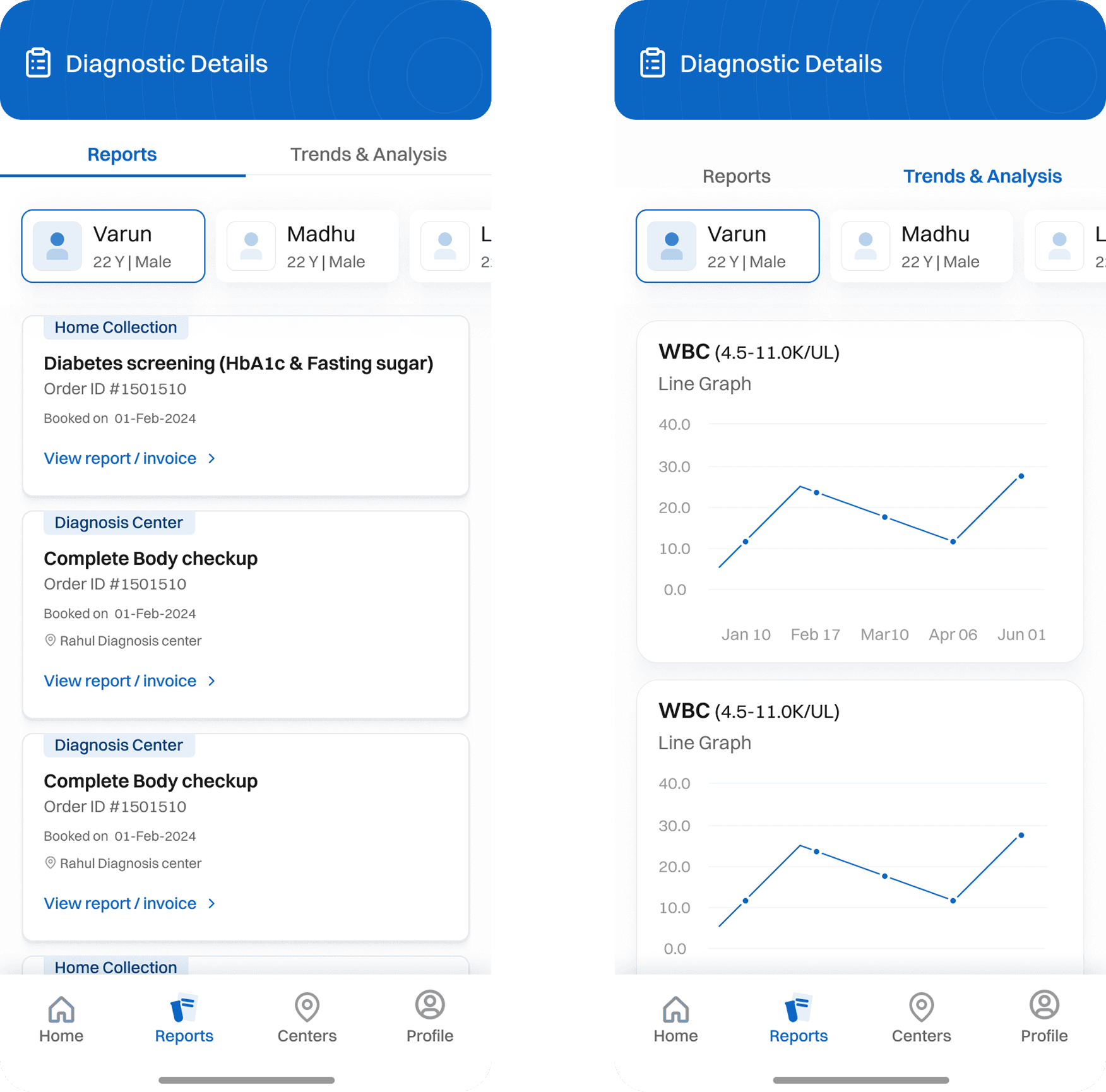 Users can now switch between family profiles, compare past results, and understand health trends without confusion. This improved clarity reduces support dependency and helps every user interpret their reports with confidence.